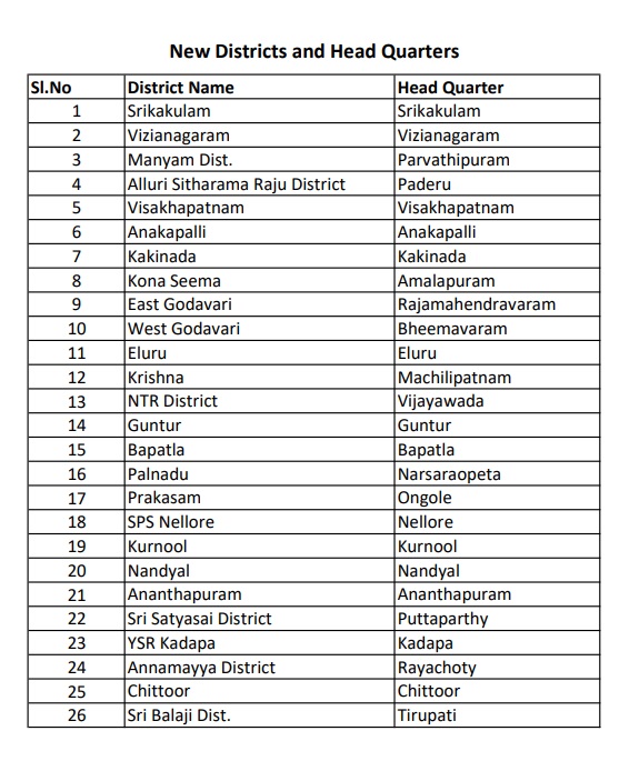 కొత్త జిల్లాలు (13): పార్వతీపురం కేంద్రంగా మన్యం జిల్లా, పాడేరు కేంద్రంగా అల్లూరి సీతారామరాజు జిల్లా, అనకాపల్లి జిల్లా, రాజమండ్రి జిల్లా, అమలాపురం కేంద్రంగా కోనసీమ జిల్లా, భీమవరం కేంద్రంగా నరసాపురం జిల్లా, విజయవాడ కేంద్రంగా ఎన్టీఆర్ జిల్లా, నరసరావుపేట కేంద్రంగా పల్నాడు జిల్లా, బాపట్ల జిల్లా, తిరుపతి కేంద్రంగా శ్రీబాలాజీ జిల్లా, రాయచోటి కేంద్రంగా అన్నమయ్య జిల్లా, పుట్టపర్తి కేంద్రంగా సత్యసాయి జిల్లా, నంద్యాల జిల్లా.