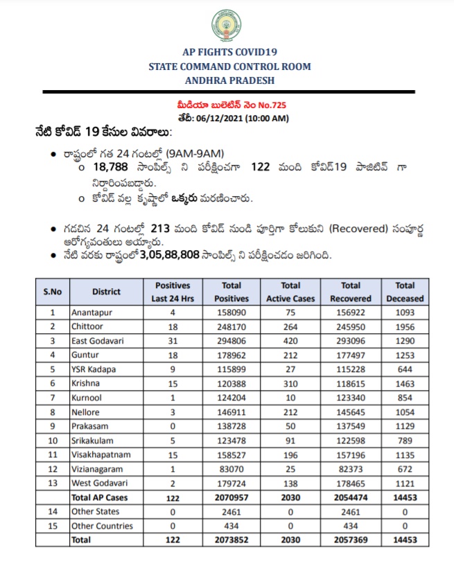 ఆంధ్రప్రదేశ్లో గడిచిన 24 గంటల్లో 18,788 కరోనా పరీక్షలు నిర్వహించగా కొత్తగా 122 మందికి కరోనా పాజిటివ్గా నిర్ధారణ అయ్యింది. దీంతో ఇప్పటివరకు నమోదైన కరోనా కేసుల సంఖ్య 20,73,852కి చేరింది. నిన్న కరోనా వల్ల కృష్ణా జిల్లాలో ఒకరు మరణించారు. దీంతో ఏపీ వ్యాప్తంగా ఇప్పటివరకు నమోదైన కరోనా మరణాల సంఖ్య 14,453కి చేరింది. మరోవైపు గడిచిన 24 గంటల్లో 213 మంది కోవిడ్ నుంచి కోలుకున్నారు. ఇప్పటివరకు 20,57,369 మంది కరోనా నుంచి కోలుకుని సంపూర్ణ ఆరోగ్యవంతులయ్యారు. ఇంకా రాష్ట్రంలో 2,030 యాక్టివ్ కేసులు ఉన్నాయి.