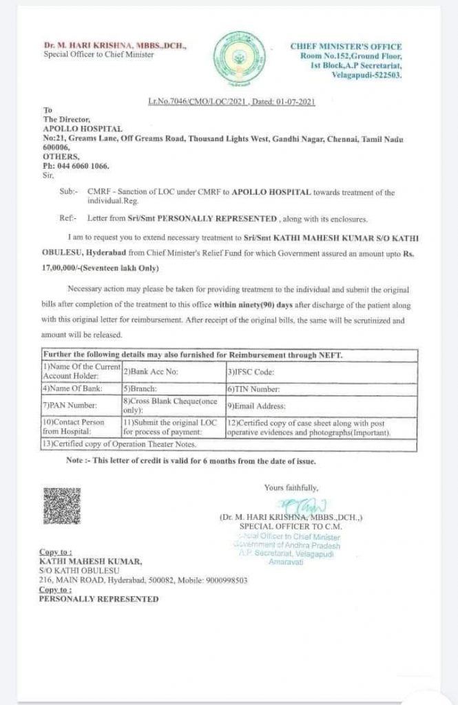 అయితే.. ఆస్పత్రిలో చికిత్స పొందుతున్న కత్తి మహేష్కు ఏపీ సర్కార్ భారీ ఆర్థిక సహాయాన్ని ప్రకటించింది. సీఎం రిలీఫ్ ఫండ్ నుంచి ఏకంగా రూ. 17 లక్షలు మేర ఆర్థిక సహాయాన్ని అందజేస్తామని ఏపీ ప్రభుత్వం ప్రకటించింది. దీనికి సంబంధించిన ఉత్తర్వులు కొద్దిసేపటి క్రితమే రిలీజ్ అయ్యాయి. ఆయనకు వైద్యం అందిస్తోన్న చెన్నై అపోలో ఆస్పత్రి యాజమాన్యానికి ఈ నిధులను బదలాయించేలా చర్యలు తీసుకుంది.