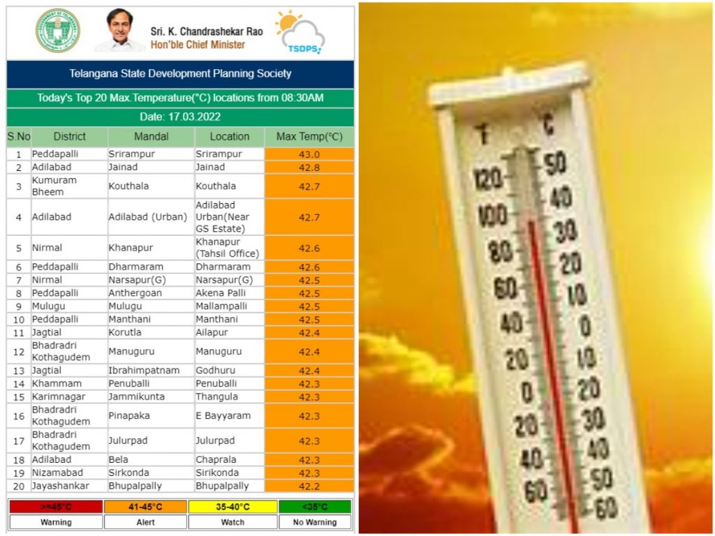 తెలంగాణలో గురువారం అనేక ప్రాంతాల్లో 42 డిగ్రీల నుంచి 43 డిగ్రీ సెంటీగ్రేడ్ వరకు ఉష్ణోగ్రతలు నమోదయ్యాయి. గరిష్ణంగా పెద్దపల్లి జిల్లాలోని శ్రీరాంపూర్లో 43 డిగ్రీల ఉష్ణోగ్రత నమోదు అయింది. ఆదిలాబాద్, భద్రాద్రి కొత్తగూడెం, కుమురంభీం ఆసిఫాబాద్, నిర్మల్, ములుగు, జగిత్యాల, ఖమ్మం, కరీంనగర్, నిజామాబాద్, జయశంకర్భూపాలపల్లి జిల్లాల్లోని పలు ప్రాంతాల్లో 42 డిగ్రీలకు పైగా ఉష్ణోగ్రతలు నమోదయ్యాయి.