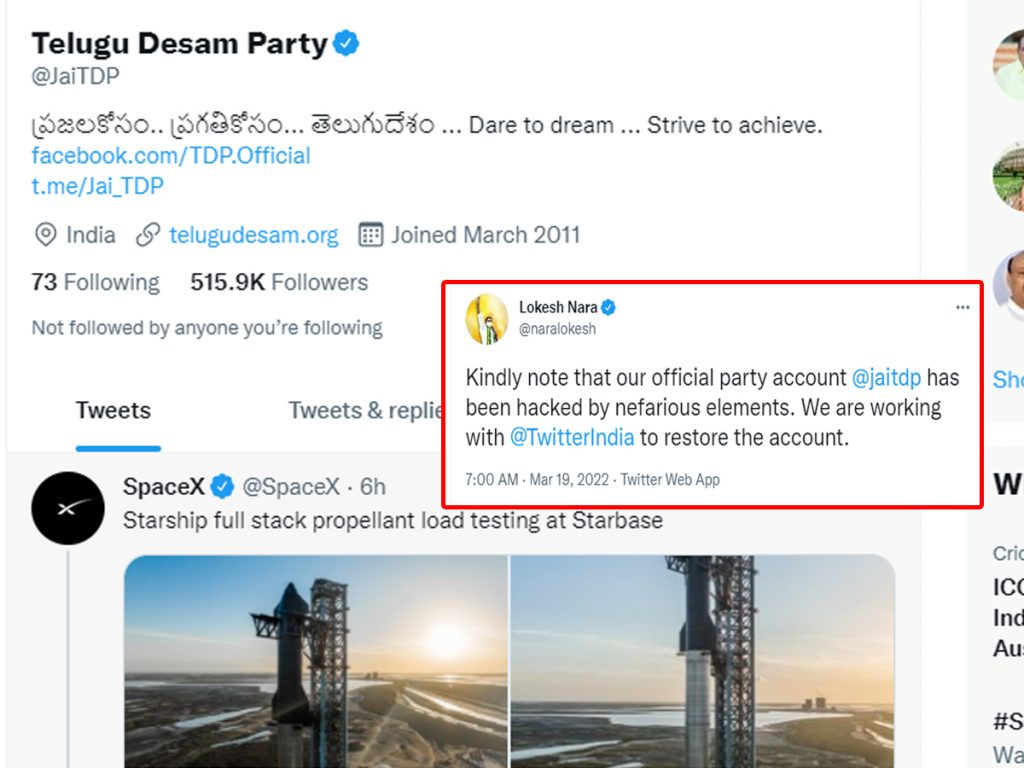 తాజాగా, ఏపీలో ప్రధాన ప్రతిపక్షమైన తెలుగుదేశం పార్టీ అధికారిక ట్విట్టర్ ఖాతాను కూడా హ్యాక్ చేశారు సైబర్ నేరగాళ్లు. ఆ ఖాతాకు టీడీపీకి బదులు ఎలాన్ మస్క్ పేరు మార్చిన హ్యాకర్స్.. విచిత్రమైన ట్వీట్లు చేశారు. ఇక, టీడీపీ అధికార ట్విట్టర్ ఖాతా హ్యాక్ అయిన విషయాన్ని వెల్లడించారు ఆ పార్టీ జాతీయ ప్రధాన కార్యదర్శి నారా లోకేష్.. పార్టీ అధికారిక ట్విట్టర్ ఖాతా హ్యాక్ అయిందంటూ వెల్లడిస్తూ ఓ ట్వీట్ చేసిన లోకేష్.. ఆ ఖాతాను పునరుద్ధరించే ప్రయత్నాలు జరుగుతున్నట్లు తన ట్విట్టర్ ఖాతాలో పేర్కొన్నారు.