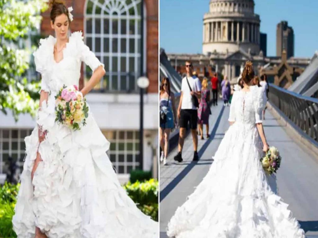 కరోనా కాలంలో మాస్క్ల వాడకం అధికమయింది. కరోనా తరువాత ప్రపంచంలో వాడిపాడేసిన మాస్క్లతో కాలుష్యమవుతుందని నిపుణులు హెచ్చరిస్తున్న నేపథ్యంలో టామ్ సిల్వర్ వుడ్ అనే డిజైనర్ డిస్పోజబుల్ మాస్క్లతో తెల్లని వెడ్డింగ్ గౌన్ను తయారు చేశారు. 1500 వాడి పడేసిన మాస్క్లతో ఈ వెడ్డింగ్ గౌన్ను తయారు చేసినట్టు ఆయన పేర్కొన్నారు. ఈ గౌన్ తయారీకి ప్రముఖ వెడ్డింగ్ ప్లానర్ సంస్థ హిచ్డ్ ఆర్థిక సహాయం అందించింది. జెమియా హాంబ్రో అనే మోడల్ ఈ డ్రెస్ను ధరించి లండన్లోని సెయింట్ పాల్స్ క్యాథెడ్రల్ ముందు ఫోజులు ఇచ్చింది. ఇంగ్లాండ్లో ఫ్రీడం డే సందర్భంగా ఈ డ్రెస్ను డిజైన్ చేశారు. ఇక ఇదిలా ఉంటే, ఒక్క బ్రిటన్లోనే వారానికి వంద మిలియన్లకు పైగా మాస్క్లను వాడి పారేస్తున్నట్టు గణాంకాలు చెబుతున్నాయి.