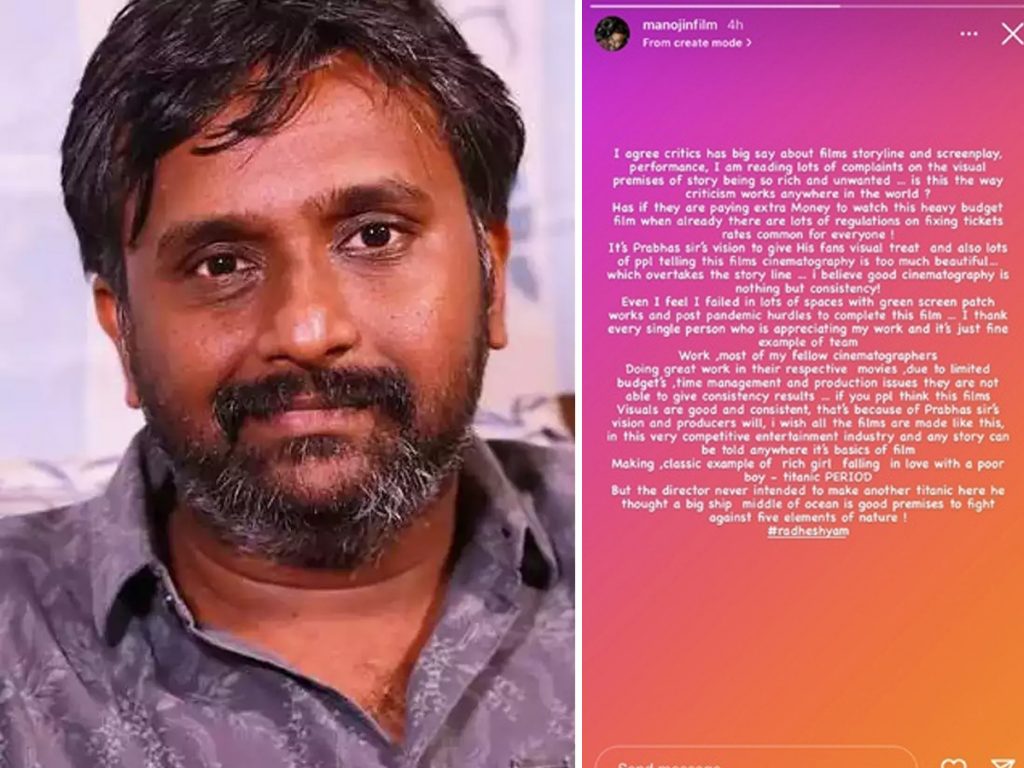 శుక్రవారం భారీ అంచనాలతో విడుదలైన “రాధే శ్యామ్” సినిమాపై ప్రేక్షకుల నుంచి మిక్స్డ్ టాక్ వస్తోంది. ప్రభాస్, పూజా హెగ్డే జంటగా నటించిన ఈ చిత్రానికి రాధా కృష్ణ కుమార్ దర్శకత్వం వహించారు. కొంతమంది నెటిజన్లు సినిమా నిర్మాతలపై తీవ్ర వ్యాఖ్యలు చేశారు. దీంతో లెన్స్ వెనుక ఉన్న వ్యక్తి మనోజ్ పరమహంస ఇన్స్టాగ్రామ్లో విమర్శించే వారికి గట్టిగానే క్లాస్ పీకారు. “సినిమాల కథాంశం, స్క్రీన్ప్లే, పనితీరు గురించి విమర్శకులు బాగా మాట్లాడతారని నేను అంగీకరిస్తున్నాను. కథ, విజువల్స్ రిచ్ గా, అవాంఛనీయంగా ఉన్నాయనే చాలా కంప్లైంట్స్ ని చూశాను. ప్రపంచంలో ఎక్కడైనా విమర్శ ఈ విధంగా ఉంటుందా? ఈ భారీ బడ్జెట్ చిత్రాన్ని వీక్షించడానికి వారు అదనపు డబ్బు చెల్లిస్తున్నారా? ఇప్పటికే అందరికీ టిక్కెట్ల ధరలను నిర్ణయించడానికి చాలా కారణాలు ఉన్నాయి” అని ఆయన రాశారు.