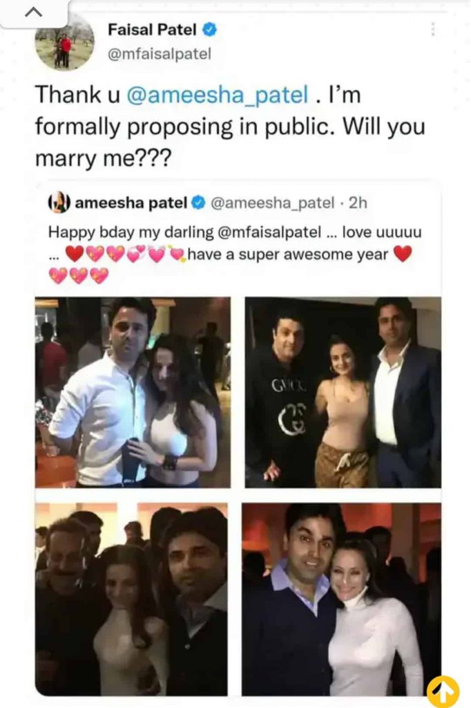 అయితే ఫైజల్ మాత్రం ఆమెకు పెళ్లి ప్రతిపాదనతో సమాధానం ఇచ్చాడు. “ధన్యవాదాలు అమీషా పటేల్. నేను అధికారికంగా బహిరంగంగా ప్రపోజ్ చేస్తున్నాను. నువ్వు నన్ను పెళ్లి చేసుకుంటావా?” అంటూ ట్వీట్ చేశారు. కానీ తర్వాత ఫైజల్ తన ట్వీట్ను తొలగించాడు. అయితే నెటిజన్లు అప్పటికే ఆయన ట్వీట్ స్క్రీన్షాట్లను తీశారు. ఫైజల్, అమృత చాలా కాలంగా రిలేషన్షిప్లో ఉన్నట్లు పుకార్లు వచ్చాయి. కానీ ఇద్దరూ ఎప్పుడూ దాని గురించి ఎప్పుడూ బహిరంగంగా మాట్లాడలేదు. ఫైజల్ HMP ఫౌండేషన్ సీఈవో. ఆయన గతంలో జైనాబ్ను వివాహం చేసుకున్నాడు. అయితే ఆయన భార్య 2017లో గుండెపోటు కారణంగా మరణించింది. మరోవైపు 45 ఏళ్ల అమీషా పటేల్ అవివాహితురాలు. అమీషా టాలీవుడ్ లో బద్రి, నాని. నరసింహుడు వంటి చిత్రాల్లో నటించింది.