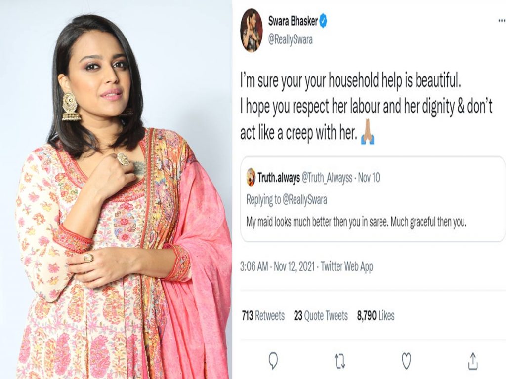 ఇక ఈ ఫోటోపై నెటిజన్లు తమదైన రీతిలో విరుచుకుపడుతున్నారు. ” నీకన్నా మా పనిమనిషి చీరలో ఇంకా అందంగా ఉంటుంది..” అని ఒక నెటిజన్ దారుణంగా కామెంట్ పెట్టాడు. ఇక ఈ కామెంట్ కి స్వరా కూడా అంతే ఘాటుగా రిప్లై ఇవ్వడం ప్రస్తుతం చర్చనీయాంశంగా మారింది. ” నాకన్నా మీ పనిమనిషి చీరలో చాలా బావుంటుందని నేను కూడా అనుకుంటున్నాను. ఆమెకు, ఆమె మీకు చేసే పనికి మీరు గౌరవం ఇవ్వాలని కోరుకొంటున్నాను.. ఆమెను ఎప్పుడు అసభ్యంగా కానీ, చులకన కానీ మాట్లాడకుండా చాలా మర్యాదగా వ్యవహరిస్తారని కోరుకుంటున్నాను” అంటూ చెప్పుకొచ్చింది. ప్రస్తుతం ఈ ట్వీట్ నెట్టింట వైరల్ గా మారింది. ఆ నెటిజన్ కి ఘాటుగా చెప్పారు అంటూ స్వరాను పలువురు ప్రశంసిస్తున్నారు.