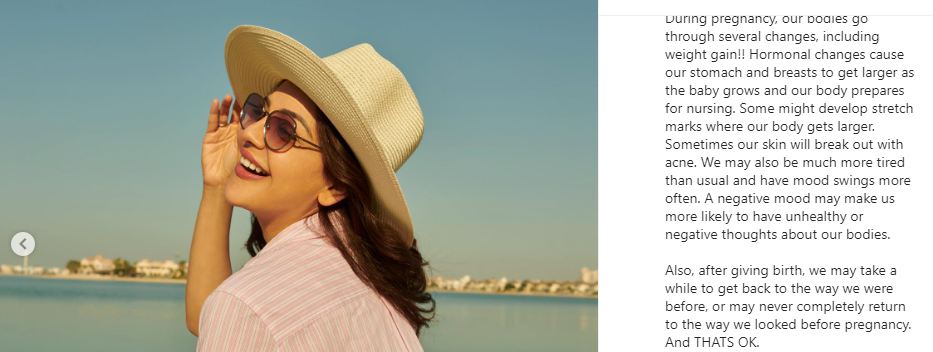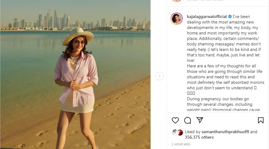 ప్రస్తుతం గర్భవతి అయిన కాజల్ అగర్వాల్ సోషల్ మీడియా ద్వారా బాడీ షేమర్స్ కు తగిన సమాధానం చెప్పింది. తనకు సంబంధించిన కొన్ని ఫోటోలను పంచుకుంటూ సుదీర్ఘమైన నోట్ను సోషల్ మీడియాలో షేర్ చేసింది. అందులో ఈ సమయంలో తనను అసౌకర్యానికి గురి చేయాల్సిన అవసరం లేదని చెప్పింది.