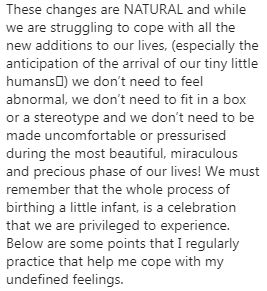 ఆ నోట్ విషయానికొస్తే “నేను నా జీవితంలో, నా శరీరం, నా ఇల్లు, ముఖ్యంగా నా పని ప్రదేశంలో అత్యంత అద్భుతమైన కొత్త పరిణామాలతో వ్యవహరిస్తున్నాను. అదనంగా కొన్ని కామెంట్లు/ బాడీ షేమింగ్ మెసేజ్లు/ మీమ్లు నిజంగా సహాయం చేయవు 🙂 దయతో ఉండడం నేర్చుకుందాం. అది చాలా కష్టం కావచ్చు. జీవించి జీవించనివ్వండి! ఇలాంటి జీవిత పరిస్థితులను అనుభవిస్తున్న వారందరికీ, ఇది చదవాల్సిన అవసరం ఉన్నవారి కోసం ఇక్కడ నా ఆలోచనలు కొన్ని ఉన్నాయి. అలాగే ప్రసవించిన తర్వాత మనం మునుపటి స్థితికి రావడానికి కొంత సమయం పట్టవచ్చు లేదా గర్భం దాల్చడానికి ముందు మనం చూసుకున్న స్థితికి తిరిగి రాకపోవచ్చు” ఆమె ఈ అంశంపై మరిన్ని సలహాలు, సూచనలు చేస్తూ మరొక గమనికను కూడా రాసింది.