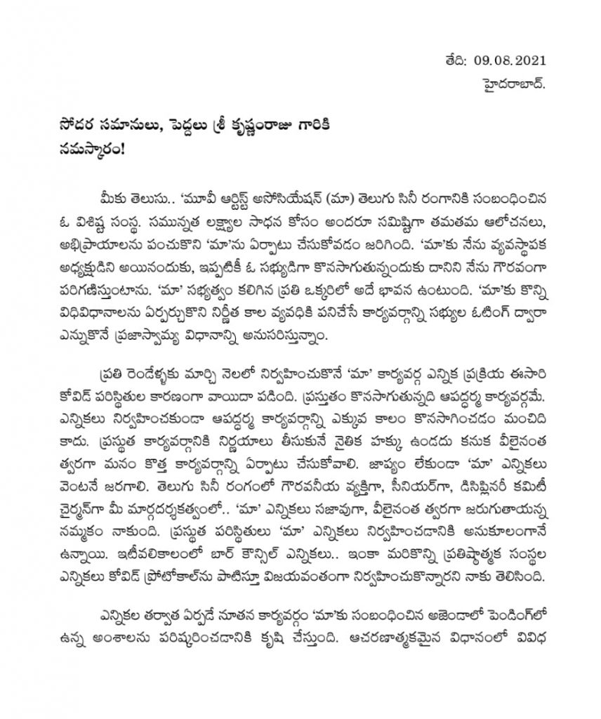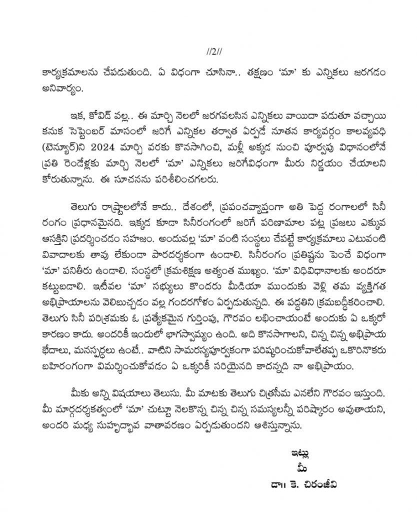 ‘మా’ ఎన్నికలు చర్చనీయాంశంగా మారడంతో ఎట్టకేలకు మెగాస్టార్ స్పందించారు. గతంలో ఎన్నడూ లేనంతగా మా అధ్యక్ష పదవికి పోటీ పడుతున్న సభ్యులు ఒకరిపై ఒకరు సంచలన ఆరోపణలు చేసుకుంటున్న విషయం తెలిసిందే. ఇప్పటికే పోటీదారుల మధ్య చీలిక రావటం, ఎన్నడూ లేనంతగా పోటీదారుల సంఖ్య పెరుగుతుండటంతో ఈసారి ఎన్నికలు రసవత్తరంగా మారాయి. ప్రకాష్ రాజ్, మంచు విష్ణు, హేమ, బాలకృష్ణ, జీవిత, ప్రస్తుత అధ్యక్షుడు నరేష్ వ్యాఖ్యలతో ‘మా’ ఎన్నికలు వివాదంగా మారిపోయాయి. ఈ నేపథ్యంలో మెగాస్టార్ చిరంజీవి ‘’మా’ క్రమశిక్షణ సంఘం అధ్యక్షుడు కృష్ణంరాజుకు లేఖ రాశారు. మా ఎన్నికలు వెంటనే జరపాలి.. ఎన్నికలు ఆలస్యమైతే సంక్షేమ కార్యక్రమాలు నిలిచిపోతాయని లేఖలో తెలిపారు. సభ్యుల బహిరంగ ప్రకటనలతో ‘మా’ ప్రతిష్ట మసకబారుతోంది.. ‘మా’ ప్రతిష్ట దెబ్బతీస్తున్న ఎవర్నీ ఉపేక్షించవద్దని చిరంజీవి లేఖలో కృష్ణంరాజును కోరారు.