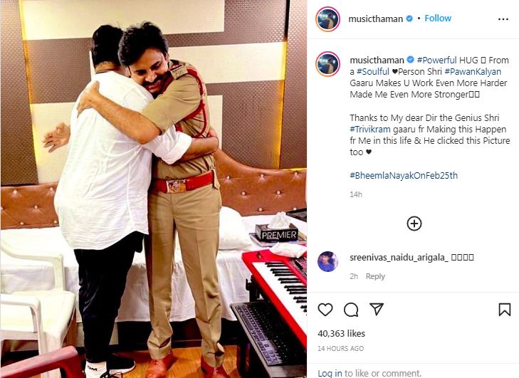 సెన్సేషనల్ మ్యూజిక్ డైరెక్టర్ తమన్ తాజాగా పంచుకున్న ఓ పిక్ నెట్టింట్లో రచ్చ చేస్తోంది. తమన్ తన ఇన్స్టాగ్రామ్ పోస్ట్లో పవర్ స్టార్ పవన్ కళ్యాణ్ నుంచి పవర్ ఫుల్ హగ్ అంటూ ఓ స్పెషల్ పిక్ ను షేర్ చేశారు. తన మ్యూజిక్ స్టూడియోలో విశేషం చోటు చేసుకుంది. ఈ పిక్స్ చూస్తుంటే “భీమ్లా నాయక్” చిత్రానికి తమన్ అద్భుతమైన సంగీతం అందించినందుకు పవన్ చాలా సంతోషంగా ఉన్నట్లు అన్పిస్తోంది. ఈ గుర్తుండిపోయే చిత్రాన్ని తీసినందుకు త్రివిక్రమ్కి కృతజ్ఞతలు తెతెలిపాడు తమన్. ఈ పిక్ ఇప్పుడు ఇంటర్నెట్ ను షేక్ చేస్తోంది.