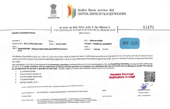 యంగ్ రెబల్ స్టార్ ప్రభాస్, పూజా హెగ్డే హీరోహీరోయిన్లుగా నటించిన పాన్ ఇండియా మూవీ “రాధే శ్యామ్”. యంగ్ డైరెక్టర్ రాధాకృష్ణ దర్శకత్వంలో రూపొందిన ఈ రొమాంటిక్ ఎంటర్టైనర్ మార్చి 11న ప్రపంచవ్యాప్తంగా గ్రాండ్ రిలీజ్కి సిద్ధంగా ఉంది. తాజాగా ఈ చిత్రం సెన్సార్ కార్యక్రమాలను పూర్తి చేసుకుని U/A సర్టిఫికేట్ను పొందింది. అంతేకాకుండా సినిమా రన్టైమ్ ను కూడా రివీల్ చేశారు మేకర్స్. సినిమా మొత్తంగా 150 నిమిషాలు ఉన్నట్టుగా సెన్సార్ సర్టిఫికెట్ లో ఉంది. అంటే 2 గంటల 30 నిముషాలు అన్నమాట. ఇక సినిమా విడుదలకు మరో 5 రోజులు మాత్రమే మిగిలి ఉండడంతో సినిమా ప్రమోషన్లపై దృష్టి పెట్టారు మేకర్స్.