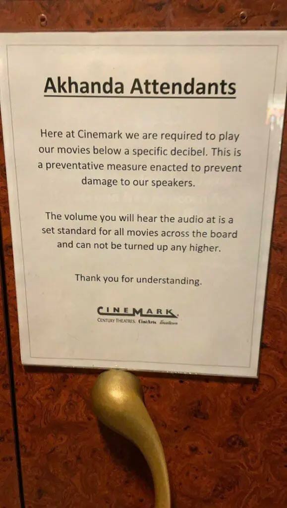 మరోవైపు యూఎస్ఏ లో సినిమాల ప్రీమియర్లు నిన్ననే ప్రీమియర్ కాగా బాలయ్య అభిమానులను ఉద్దేశించి సినిమార్క్ థియేటర్లో అలర్ట్ పెట్టారు. థియేటర్ సౌండ్ని నిర్దిష్ట డెసిబుల్స్కు పరిమితం చేసిందని, ఏది ఏమైనప్పటికీ సౌండ్ పెరగదని అభిమానులకు తెలుపుతూ ఓ నోటీసు అంటించడం నెట్టింట్లో వైరల్ అవుతోంది. యూఎస్ఏలో ఒక తెలుగు సినిమాకు ఇలా జరగడం ఇదే మొదటిసారి.