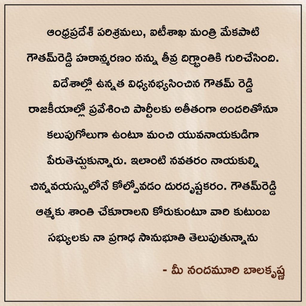 నాకు అత్యంత ఆత్మీయులు, సహృదయులు, విద్యావంతులు ఆంధ్రప్రదేశ్ ఐటి శాఖ మంత్రివర్యులు శ్రీ మేకపాటి గౌతంరెడ్డి గారు గుండెపోటుతో పరమపదించారని తెలిసి మా ఇంటిల్లిపాది తీవ్ర దిగ్భ్రాంతికి గురయ్యాము. (1/2)