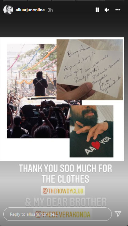 ఇక దీనికి సమాధానంగా ఈ స్వెట్షర్ట్ ని బన్నీకి గిఫ్ట్ గా ఇచ్చింది రౌడీ స్టార్ విజయ్ దేవరకొండ అన్నట్లు అల్లు అర్జున్ తన ఇన్స్టాగ్రామ్ ద్వారా తెలిపాడు. విజయ్ దేవరకొండ రౌడీ బ్రాండ్ తో బట్టల వ్యాపారం చేస్తున్న సంగతి తెలిసిందే. ఇప్పటికే పలుమార్లు బన్నీకి విజయ్ స్పెషల్ క్లాత్స్ పంపించాడు. ఇక తాజాగా పుష్ప సినిమాకు కంగ్రాట్స్ చెప్తూ తన రౌడీ క్లబ్ క్లాతింగ్ నుంచి కస్టమైజ్డ్ చేయించిన బ్లాక్ కలర్ స్వెట్షర్ట్ను బన్నీకి బహుమతిగా అందించాడు. ఇక ఈ స్వెట్షర్ట్ తోనే బన్నీ థియేటర్లో సందడి చేశాడు. అంతేకాకుండా క్లాత్స్ పంపిన విజయ్ కి బన్నీ థాంక్స్ చెప్పాడు.. విజయ్ రాసిన లెటర్ ని, క్లాత్స్ ఫోటోని షేర్ చేస్తూ “బట్టలు పంపినందుకు థాంక్స్ మై డియర్ బ్రదర్ దేవరకొండ” అంటూ చెప్పుకొచ్చాడు. ప్రస్తుతం ఈ స్వెట్షర్ట్ నెట్టింట వైరల్ గా మారింది.