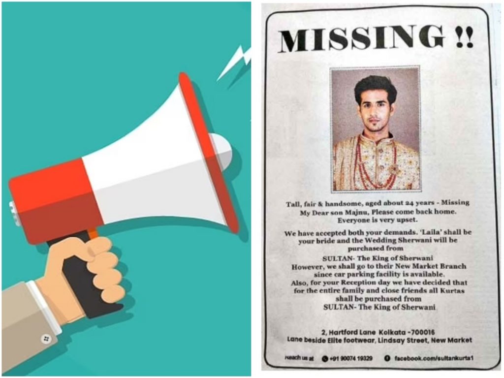 వివరాల్లోకి వెళ్తే… సుల్తాన్ బట్టల షాప్ నిర్వాహకులు ‘మిస్సింగ్’ అంటూ ఓ ప్రకటన ఇచ్చారు. సదరు ప్రకటనలో ఓ యువకుడి ఫోటోను ప్రచురించి దాని కింద ఓ మేటర్‌ను రాశారు. ‘బాబూ మజ్ను. నీ డిమాండ్లన్నీ ఒప్పుకుంటున్నాం. లైలాతోనే నీకు వివాహం జరిపిస్తాం. అంతేకాదు పెళ్లికి షేర్వాణి కూడా నువ్వు కోరుకున్న సుల్తాన్ దుకాణంలోనే కొనుగోలు చేస్తాం. కొత్తగా పెట్టిన బ్రాంచీలో పార్కింగ్ సౌకర్యం కూడా ఉందట. కనుక అక్కడే షాపింగ్ చేద్దాం’ అని ప్రకటనలో పేర్కొన్నారు. ఈ ప్రకటన చూసిన వారంతా నోరెళ్లబెడుతున్నారు. బట్టల షాప్ ప్రకటనలు ఇలా కూడా ఇస్తారా బాబూ అంటూ సోషల్ మీడియాలో కామెంట్లు చేస్తున్నారు.