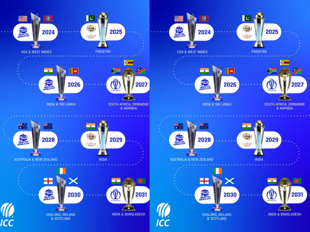 అలాగే… 2026 టీ20 వరల్డ్ కప్ ఇండియా, శ్రీలంక లో జరుగనుంది. ఇక 2027 వరల్డ్ కప్ కు సౌతాఫ్రికా, జింబాబ్వే, నమీబియా వేదికలు కానున్నాయి. అలాగే… 2028 టీ20 వరల్డ్ కప్ ఆసీస్, న్యూజిలాండ్ దేశాలు వేదికలు కానున్నాయి. 2029 లో చాంపియన్ ట్రోఫికి ఇండియా వేదిక కానుంది. 2030 టీ 20 వరల్డ్ కప్కు ఇంగ్లండ్, ఐర్లాండ్, స్కాట్లాండ్ లు వేదికలు కానున్నాయి. 2031 వరల్డ్ కప్ కు ఇండియా, బంగ్లా దేశ్ దేశాలు వేదికలు కానున్నాయి.