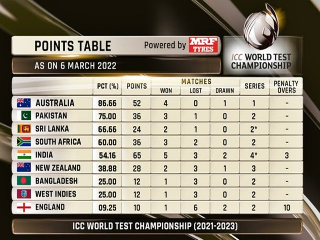 డబ్ల్యూటీసీలో భాగంగా టీమిండియా ఇప్పటివరకు 10 మ్యాచ్లు ఆడగా వాటిలో 5 విజయాలు, మూడు పరాజయాలు, రెండు డ్రాలు ఉన్నాయి. ఇంగ్లండ్, న్యూజిలాండ్, దక్షిణాఫ్రికా, శ్రీలంక టీమ్లతో భారత్ టెస్టులు ఆడింది. తద్వారా 65 పాయింట్లు సాధించి ఐదో స్థానంలో ఉంది. డబ్ల్యూటీసీ పాయింట్ల పట్టికలో ఆస్ట్రేలియా అగ్రస్థానంలో కొనసాగుతోంది. ఆసీస్ ఇప్పటి వరకు ఐదు టెస్టులు ఆడగా నాలుగు మ్యాచ్లలో గెలిచి ఒకటి డ్రా చేసుకుని 52 పాయింట్లు సాధించింది. పాకిస్తాన్, శ్రీలంక, దక్షిణాఫ్రికా 2, 3, 4 స్థానాల్లో ఉన్నాయి. డిఫెండింగ్ ఛాంపియన్ న్యూజిలాండ్ ఆరు మ్యాచ్లు ఆడగా.. వాటిలో రెండు మ్యాచ్లు గెలిచి, మూడు పరాజయాలు, ఒక డ్రాతో ఆరో స్థానంలో కొనసాగుతోంది.