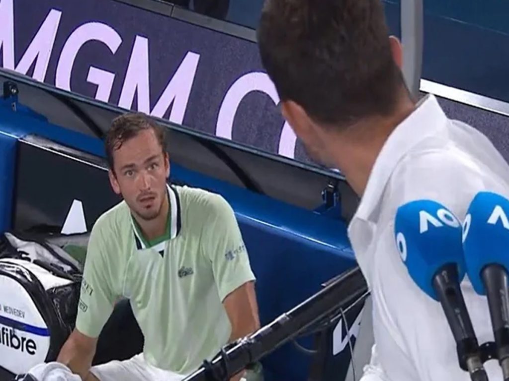 ఆస్ట్రేలియన్ ఓపెన్ టోర్నీలో శుక్రవారం జరిగిన సెమీఫైనల్ మ్యాచ్లో రష్యా ఆటగాడు డానిల్ మెద్వెదెవ్ మ్యాచ్ మధ్యలో అంపైర్పై నోరు పారేసుకున్నాడు. ప్రత్యర్థి ఆటగాడు స్టెఫానో సిట్సిపాస్కు గ్యాలరీలో కూర్చున్న అతడి తండ్రి సలహాలు ఇస్తున్నాడని మెద్వెదెవ్ ఆరోపించాడు. నీకది కనిపించడంలేదా? నువ్వు మూర్ఖుడివా? అంటూ అంపైర్ను దుర్భాషలాడాడు. ఈ సంభాషణలు సోషల్ మీడియాలో వైరల్ అయ్యాయి.