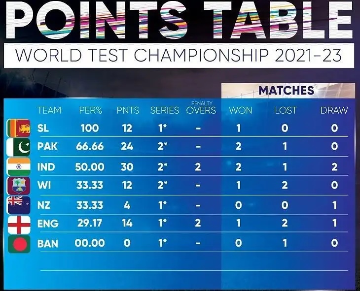 మరోవైపు కాన్పూర్ టెస్టులో భారత్ను విజయం ఊరించి ఉసూరుమనిపించింది. ఈ టెస్టును భారత్ గెలిచి ఉంటే భారత్ ఖాతాలో 12 పాయింట్లు చేరేవి. విన్నింగ్ పర్సంటేజీ కూడా పెరిగేది. కానీ డ్రా కావడంతో భారత్ ఖాతాలో 4 పాయింట్లు మాత్రమే చేరాయి. అటు విజయాల శాతం కూడా తగ్గిపోయింది. టెస్ట్ ఛాంపియన్ షిప్ పాయింట్ల పట్టికలో శ్రీలంక అగ్రస్థానంలో కొనసాగుతోంది. న్యూజిలాండ్ 5వ స్థానంలో ఉండగా, ఇంగ్లండ్ జట్టు 6వ స్థానంలో ఉంది.