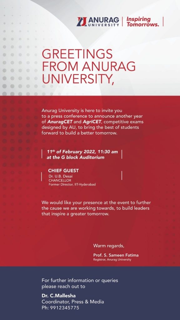 విద్యార్థుల భవిష్యత్ను దృష్టిలో ఉంచుకుని రానున్న కాలానికి అనుగుణంగా అనురాగ్ సెట్, అగ్రి సెట్ పేర్లతో ఎంట్రన్స్ పరీక్షలను అనురాగ్ యూనివర్సిటీ యాజమాన్యం ప్రవేశపెట్టింది. ఇంజనీరింగ్ విభాగానికి సంబంధించి అనురాగ్ సెట్ ప్రవేశ పరీక్ష ఏర్పాటు చేయగా.. అగ్రికల్చర్ విభాగానికి సంబంధించి అగ్రి సెట్ను ఏర్పాటు చేశారు. అనురాగ్ సెట్, అగ్రి సెట్ పరీక్షలకు సంబంధించి తేదీని ఖరారు చేశారు. ఆయా పరీక్షలకు ఆన్లైన్ దరఖాస్తులను మార్చి 3 వరకు సమర్పించవచ్చని యూనివర్సిటీ అధికారులు నిర్ణయించారు. మార్చి 4 నుంచి 6వ తేదీ వరకు మూడు రోజుల పాటు ఈ పరీక్ష నిర్వహించనున్నట్లు యూనివర్సిటీ ఛాన్సిలర్ యూ.బి దేశాయ్ పేర్కొన్నారు. ఈ కార్యక్రమంలో అనురాగ్ యూనివర్సిటీ సీఈవో నీలిమ, అనురాగ్ యూనివర్సిటీ యాజమాన్యం అధ్యాపకులు పాల్గొన్నారు.