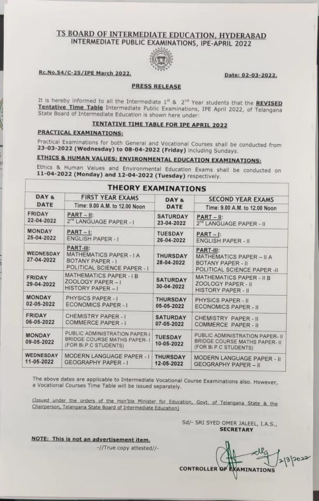 ఇంటర్ ఫస్టియర్ పరీక్షల షెడ్యూల్: ఏప్రిల్ 22న సెకండ్ లాంగ్వేజ్ పేపర్-1, ఏప్రిల్ 25న, ఇంగ్లీష్ పేపర్-1, 27న మ్యాథమెటిక్స్ పేపర్-1A, బోటనీ పేపర్-1, పొలిటికల్ సైన్స్ పేపర్-1, 29న మేథమెటిక్స్ పేపర్-1B, జువాలజీ పేపర్-1, హిస్టరీ పేపర్-1, మే 2న ఫిజిక్స్ పేపర్-1, అర్థశాస్త్రం పేపర్-1, మే 6న కెమిస్ట్రీ పేపర్-1, కామర్స్ పేపర్-1, మే 9న పబ్లిక్ అడ్మినిస్ట్రేషన్ పేపర్-1, బ్రిడ్జ్ కోర్స్ మ్యాథమెటిక్స్ పేపర్-1 (బైపీసీ విద్యార్థులకు), మే 11న మోడర్న్ లాంగ్వేజ్ పేపర్-1, జాగ్రఫీ పేపర్-1 పరీక్షలు జరగనున్నాయి.