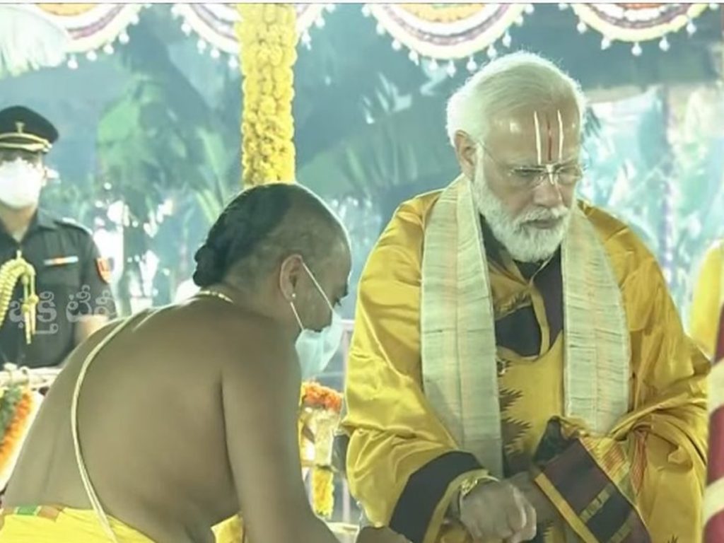 హైదరాబాద్ ముచ్చింతల్లోని శ్రీరామనగరంలో రామానుజ సహస్రాబ్ది వేడుకలు ఘనంగా జరుగుతున్నాయి. నాలుగో రోజు ఉత్సవాల్లో భాగంగా 216 అడుగుల రామానుజ విగ్రహాన్ని ప్రధాని మోదీ ఆవిష్కరించి జాతికి అంకితం చేశారు. ఈ సందర్భంగా తిరునామం పెట్టుకుని పట్టువస్త్రాలను నరేంద్ర మోదీ కట్టుకున్నారు. సంప్రదాయ వస్త్రాలలో యాగశాలలో జరిగిన కార్యక్రమాల్లో పాల్గొన్నారు. సమతా మూర్తి విగ్రహం బరువు 1800 కిలోలు కాగా.. గర్భగుడిలో 120 కిలోల బంగారు విగ్రహాన్ని ఏర్పాటు చేశారు. ప్రపంచంలోనే కూర్చున్న భంగిమలో ఉన్న రెండో అతి పెద్ద విగ్రహం ఇది.
