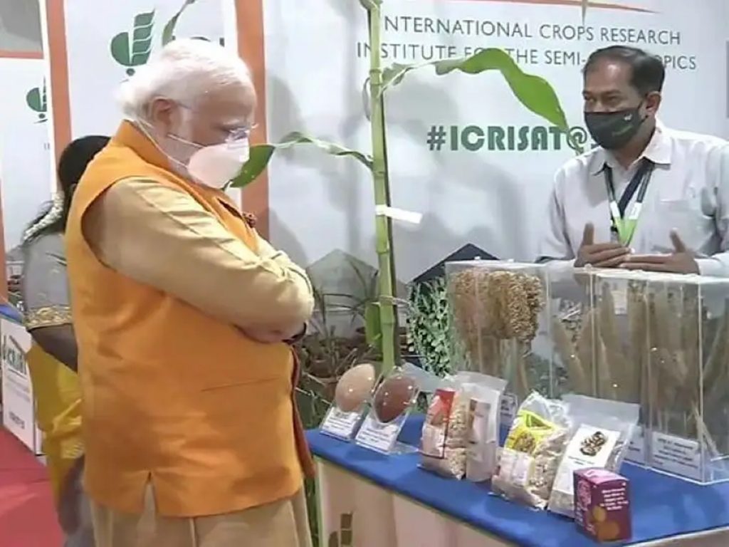 వాతావరణ మార్పులను తట్టుకునే కొత్త వంగడాలను సృష్టించాలని ఇక్రిశాట్ శాస్త్రవేత్తలకు ప్రధాని మోదీ పిలుపునిచ్చారు. దేశంలో 170 కరువు జిల్లాల్లో ప్రత్యేక చర్యలు చేపడుతున్నామని, బడ్జెట్లో సేంద్రీయ సాగుకు ప్రాధాన్యం ఇచ్చామని తెలిపారు. డిజిటల్ టెక్నాలజీ ద్వారా రైతులకు తోడ్పాటునివ్వాలని చెప్పారు. వాతావరణ సవాలు నుండి మన రైతులను కాపాడటానికి తమ దృష్టి ప్రాథమికాంశాలపై భవిష్యత్ అవసరాలపై ఉందన్నారు. దేశంలో 80 శాతం మంది చిన్న రైతులు సంక్షోభం ఎదుర్కొంటున్నారని, వారి సాగు వ్యయం తగ్గించాల్సి ఉందన్నారు. బయో ఫ్యూయల్ వల్ల రైతుల ఖర్చులు తగ్గుతాయన్నారు. వ్యవసాయంలో టెక్నాలజీని పెంచుతున్నామని, డిజిటల్ అగ్రికల్చర్ పెంచాలనే లక్ష్యంతో ఉన్నామని ప్రధాని మోదీ అన్నారు. తెలుగు రాష్ట్రాల్లో పామాయిల్ సాగును మరింత ప్రోత్సహిస్తామని తెలిపారు. దేశంలో ఆహార ధాన్యాలు సరిపడా ఉన్నాయని, న్యూట్రిషన్ సెక్యూరిటీపై దృష్టి పెట్టామని తెలిపారు.