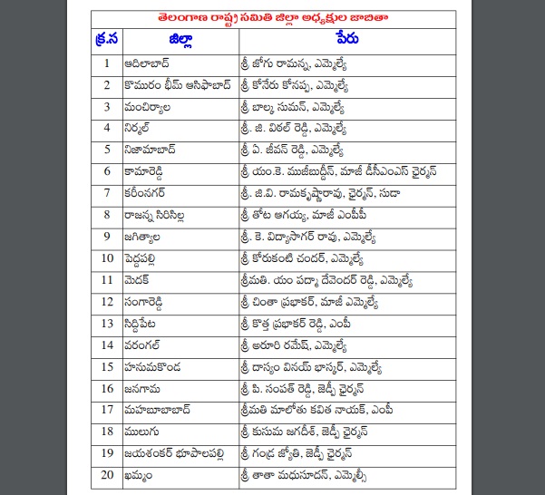 జిల్లాల వారీగా టీఆర్ఎస్ అధ్యక్షుల జాబితా: