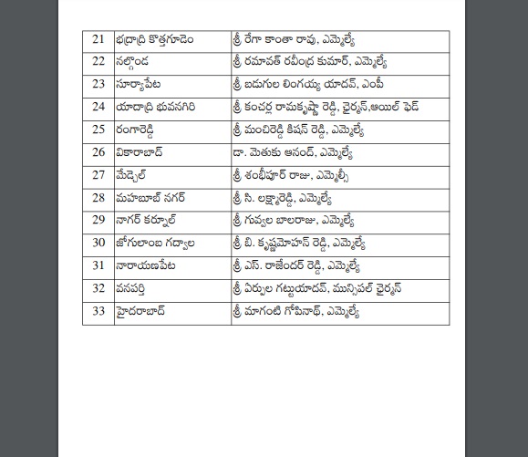 ఆదిలాబాద్: జోగురామన్న, ఆసిఫాబాద్: కోనప్ప, మంచిర్యాల: బాల్కసుమన్, నిర్మల్: విఠల్ రెడ్డి, నిజామాబాద్: జీవన్ రెడ్డి, కామారెడ్డి: ముజీబుద్దీన్, కరీంనగర్: రామకృష్ణారావు, సిరిసిల్ల: తోట ఆగయ్య, జగిత్యాల: విద్యాసాగర్రావు, పెద్దపల్లి: కోరుకంటి చందర్, సిద్దిపేట: కొత్త ప్రభాకర్రెడ్డి, మెదక్: పద్మా దేవేందర్ రెడ్డి, సంగారెడ్డి: చింతా ప్రభాకర్, వరంగల్: ఆరూరి రమేష్, హన్మకొండ: వినయ్ భాస్కర్, జనగామ: సంపత్ రెడ్డి, మహబూబాబాద్: మాలోతు కవిత, ములుగు: కుసుమ జగదీష్, భూపాలపల్లి: గండ్ర జ్యోతి, ఖమ్మం: తాతా మధుసూదన్, భద్రాద్రి: రేగా కాంతారావు, నల్గొండ: రవీంద్రనాయక్, సూర్యాపేట: లింగయ్య యాదవ్, యాదాద్రి: కంచర్ల రామకృష్ణారెడ్డి, రంగారెడ్డి: మంచిరెడ్డి కిషన్రెడ్డి, వికారాబాద్: మెతుకు ఆనంద్, మేడ్చల్: శంభీపూర్ రాజు, మహబూబ్నగర్: లక్ష్మారెడ్డి, నాగర్కర్నూలు: గువ్వల బాలరాజు, గద్వాల: కృష్ణమోహన్రెడ్డి, నారాయణపేట: రాజేందర్రెడ్డి, వనపర్తి: గట్టు యాదవ్, హైదరాబాద్: మాగంటి గోపీనాథ్