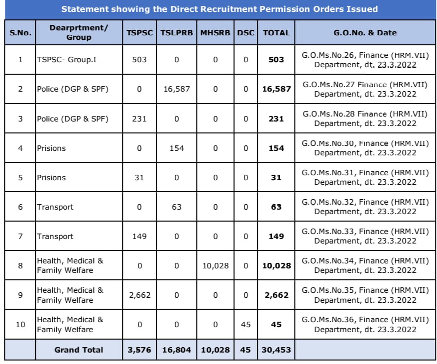 Telangana Finance Department Green Signal to Recruit 30,453 Jobs.