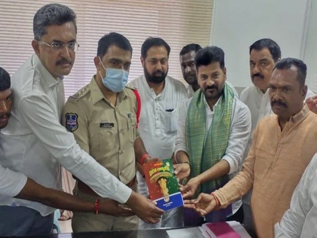 పవిత్రమైన భారత రాజ్యాంగాన్ని అవమానపరిచారని ఆరోపిస్తూ సీఎం కేసీఆర్పై సిద్దిపేట జిల్లా గజ్వేల్ పోలీస్ స్టేషన్లో టీపీసీపీ చీఫ్ రేవంత్రెడ్డి పోలీసులకు ఫిర్యాదు చేశారు. ఈ మేరకు సీఐ వరప్రసాద్కు ఫిర్యాదుతో పాటు రాజ్యాంగం ప్రతిని కూడా అందజేశారు. తమ ఫిర్యాదు ఆధారంగా సీఎం కేసీఆర్పై చర్యలు తీసుకోవాలని రేవంత్ రెడ్డి పోలీసులను కోరారు. ఈ కార్యక్రమంలో సిద్దిపేట జిల్లా కాంగ్రెస్ అధ్యక్షుడు నర్సారెడ్డి కూడా పాల్గొన్నారు.
