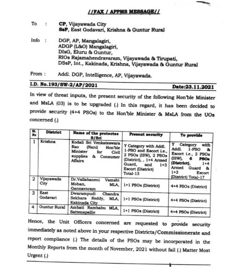 ఎమ్మెల్యేలు వల్లభనేని వంశీ, అంబటి రాంబాబు, ద్వారంపూడి చంద్రశేఖర్ లకు ప్రస్తుతం ఉన్న 1+1 గన్ మెన్ ల తో పాటు అదనంగా 3+3 గన్ మెన్ భద్రత కల్పించింది ప్రభుత్వం. చంద్రబాబుపై వ్యాఖ్యల అనంతరం సామాజిక మాధ్యమాల్లో వారికి బెదిరింపులు వచ్చినట్టుగా ఫిర్యాదు. ఫిర్యాదుల పరిశీలన అనంతరం వారి భద్రతను సమీక్షించింది కమిటీ. వారికి తక్షణం భద్రత కల్పిస్తూ నిర్ణయం తీసుకుంది. ఇవాళ్టి నుంచి మంత్రి కొడాలి, ఎమ్మెల్యేలు వంశీ, అంబటి, ద్వారంపూడిలకు అదనపు సిబ్బందిని నియమించింది ప్రభుత్వం. అయితే, తమకు అధికారిక సమాచారం లేదంటున్నారు ద్వారంపూడి, అంబటి రాంబాబు.
