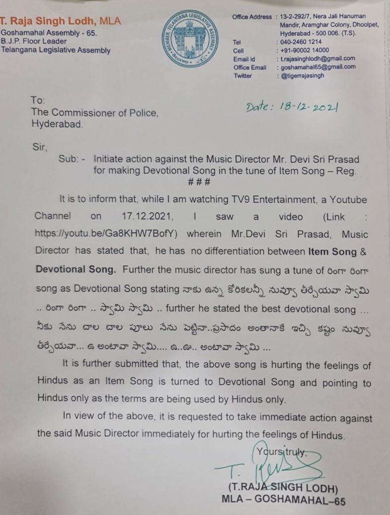 వెంటనే దేవి శ్రీ ప్రసాద్ పై చర్యలు తీసుకోవాలని లేఖ లో పేర్కొన్నారు రాజసింగ్. దేవి శ్రీ ప్రసాద్ వ్యహారాల శైలితో హిందువుల మనోభావాలు దెబ్బతిన్నాయని ఫిర్యాదు చేశారు. వెంటనే దేవి శ్రీ ప్రసాద్ పై చర్యలు తీసుకోవాలని కమిషనర్ ను కోరారు రాజాసింగ్. అయితే.. దీనిపై చిత్ర బృందం, దేవీ ప్రసాద్ ఎలా స్పందిస్తారో చూడాలి.