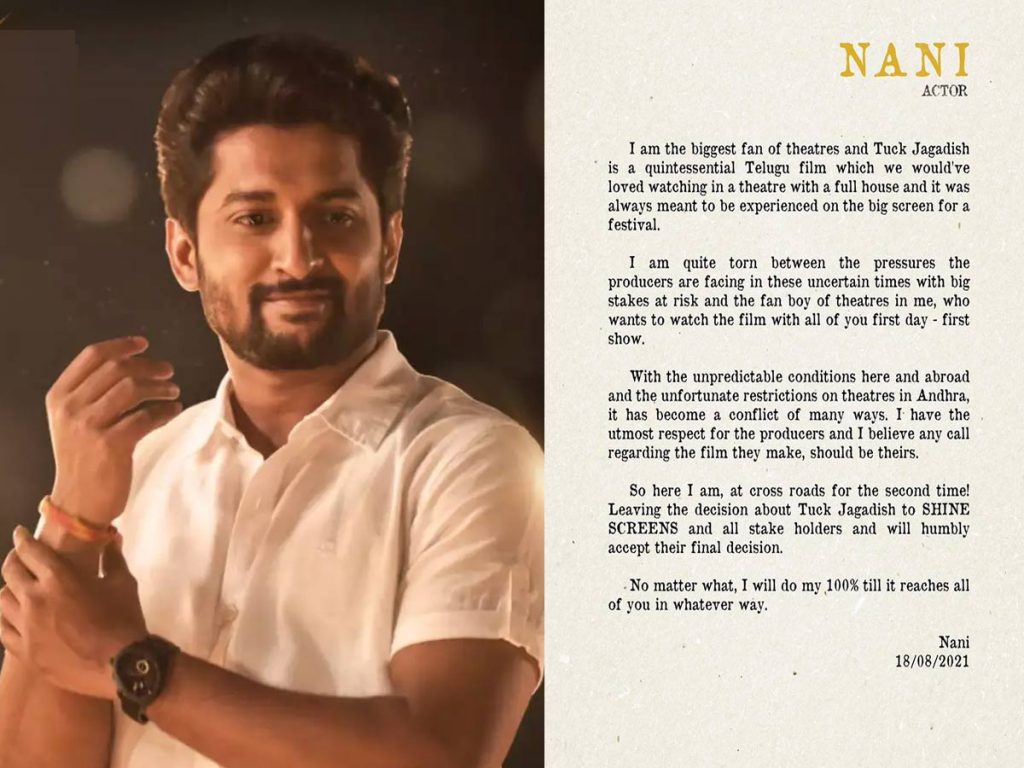 అక్కినేని నాగచైతన్య ‘లవ్ స్టోరీ’ మూవీ విడుదల తేదీని ప్రకటించగానే… నేచురల్ స్టార్ నాని ‘టక్ జగదీశ్’ మూవీ రిలీజ్ పై తన మనసులోని మాటను బయట పెట్టాడు. ‘టక్ జగదీశ్’ మూవీ ఓటీటీలో విడుదల కాబోతోందని కొద్ది రోజులుగా జరుగుతున్న ప్రచారానికి ఫుల్ స్టాప్ పెట్టకుండా, తాను మరోసారి క్రాస్ రోడ్స్ లో నిలబడినట్టు అయ్యిందనే ఆవేదనను వ్యక్తం చేశాడు. ఓ సినీ అభిమానిగా అందరితో కలిసి ఫస్ట్ డే ఫస్ట్ షో చూడడమే తనకు ఇష్టమని, ‘టక్ జగదీశ్’ మూవీని కూడా థియేట్రికల్ ఎక్స్ పీరియన్స్ కోసమే తీశామని చెప్పాడు.