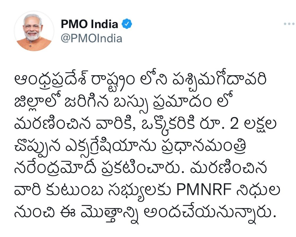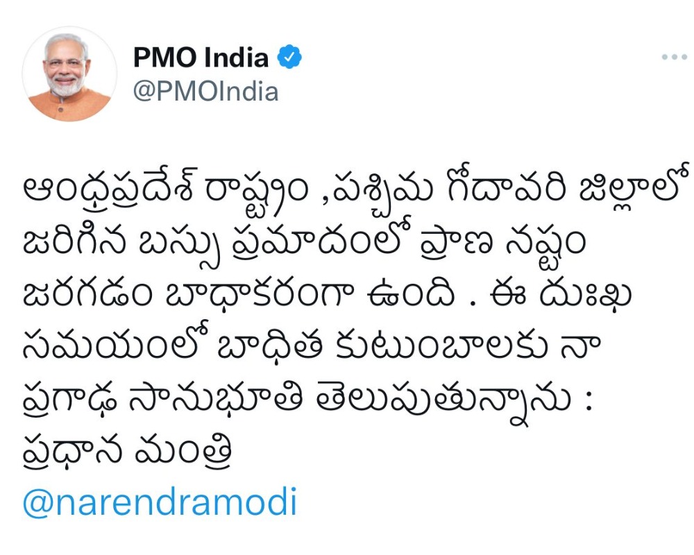 ప్రధానమంత్రి కార్యాలయం ఈ ఘటనపై విచారం వ్యక్తం చేసింది. ఆంధ్రప్రదేశ్ రాష్ట్రం ,పశ్చిమ గోదావరి జిల్లాలో జరిగిన బస్సు ప్రమాదంలో ప్రాణ నష్టం జరగడం బాధాకరంగా ఉంది . ఈ దుఃఖ సమయంలో బాధిత కుటుంబాలకు నా ప్రగాఢ సానుభూతి తెలుపుతున్నాను అన్నారు ప్రధాన మంత్రి నరేంద్రమోడీ. పశ్చిమగోదావరి జిల్లాలో జరిగిన బస్సు ప్రమాదం లో మరణించిన వారికి, ఒక్కొక్కరికి రూ.2 లక్షల చొప్పున ఎక్స్ గ్రేషియాను ప్రధానమంత్రి నరేంద్రమోదీ ప్రకటించారు. మరణించిన వారి కుటుంబ సభ్యులకు PMNRF నిధుల నుంచి ఈ మొత్తాన్ని అందచేయనున్నారు. గాయపడ్డవారు త్వరగా కోలుకోవాలని ప్రధాని ఆకాంక్షించారు.ఏపీలో బస్ ప్రమాదంపై స్పందించిన ప్రధాని మోదీకి కృతజ్ఞతలు తెలిపారు ఏపీ బీజేపీ అధ్యక్షుడు సోము వీర్రాజు.