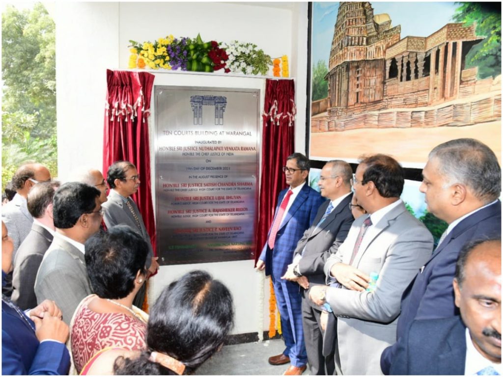 భద్రకాళీ ఆలయం వద్దకు చేరుకున్న జస్టిస్ ఎన్వీరమణ దంపతులకు అర్చకులు పూర్ణ కుంభంతో స్వాగతం పలికారు. అనంతరం దేవాలయంలో ప్రత్యేక పూజలు నిర్వహించారు. ఆధునిక సదుపాయాలతో నిర్మించిన పది కోర్టుల సముదాయాన్ని, పోక్సో కోర్టు, ఫ్యామిలీ కోర్టును సుప్రీం కోర్టు చీఫ్ జస్టిస్ ఎన్వీ రమణ ప్రారంభించారు. కోర్టు ప్రాంగణంలో శిలాఫలకాన్ని ఆయన ఆవిష్కరించారు. అనంతరం తెలంగాణ హైకోర్టు ప్రధాన న్యాయమూర్తి జస్టిస్ సతీశ్ చంద్ర శర్మతో కలిసి సీజేఐ కోర్టు ప్రాంగణాన్ని పరిశీలించారు. అనంతరం ఏర్పటు చేసిన సమావేశం లో ఆయన మాట్లాడారు.