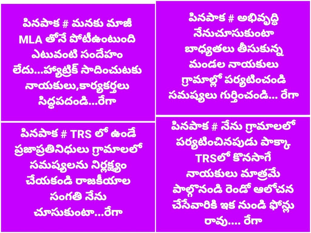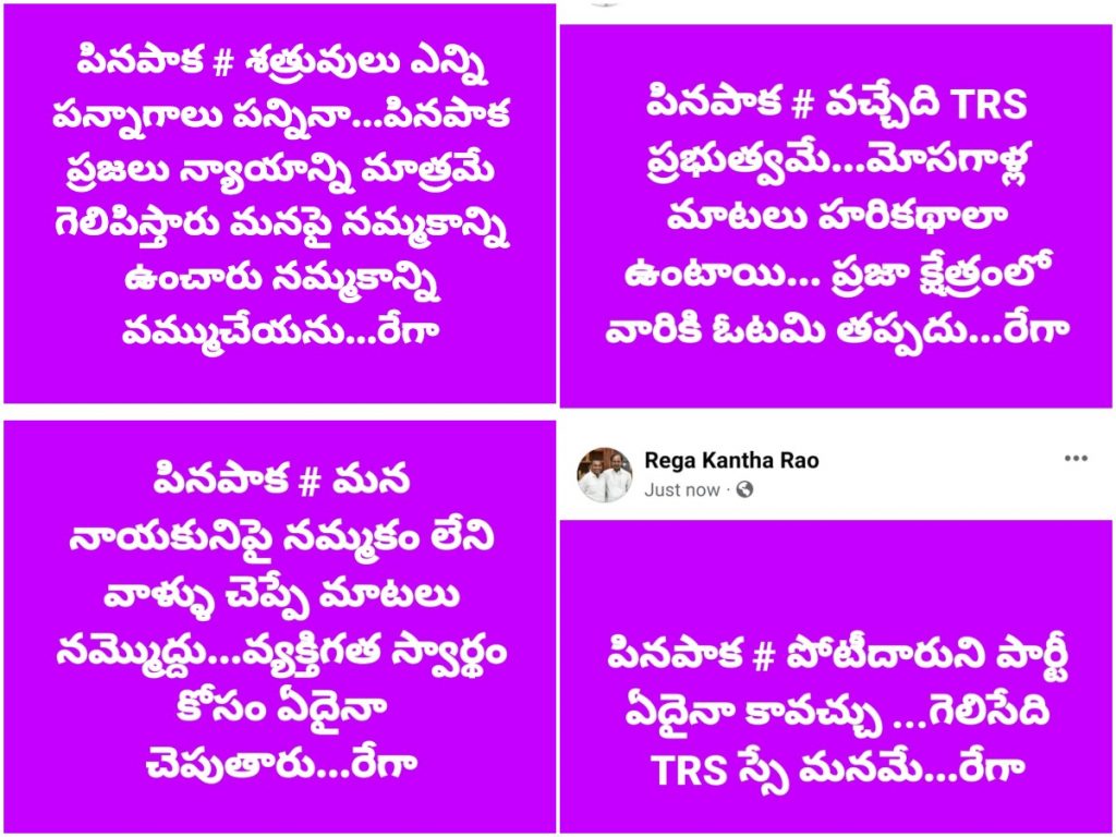 మనకు మాజీ ఎమ్మెల్యేతోనే పోటీ వుంటుంది. ఎటువంటి సందేహం లేదు. హ్యాట్రిక్ సాధించేందుకు నాయకులు, కార్యకర్తలు సిద్ధపడండి. పోటీదారుని పార్టీ ఏదైనా కావచ్చు. గెలిచేది టీఆరెస్సే మనమే. శత్రువులు ఎన్ని పన్నాగాలు పన్నినా పినపాక ప్రజలు న్యాయాన్ని మాత్రమే గెలిపిస్తారు. మనపై నమ్మకం ఉంచారు. వారి నమ్మకాన్ని వమ్ముచేయను. వచ్చేది టీఆర్ఎస్ ప్రభుత్వమే. మోసగాళ్ళ మాటలు హరికథల్లా వుంటాయి. ప్రజాక్షేత్రంలో వారికి ఓటమి తప్పదు. మన నాయకునిపై నమ్మకం లేని వాళ్ళు చెప్పే మాటలు నమ్మొద్దు. వ్యక్తిగత స్వార్థం కోసం ఏదైనా చెబుతారు.. అంటూ వరుస ట్వీట్లతో రేగా రచ్చ రేపారు. ఈ ట్వీట్లు సోషల్ మీడియాలో, టీఆర్ఎస్ పార్టీలో హాట్ టాపిక్ అవుతున్నాయి.