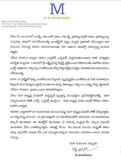 తను మా అధ్యక్ష పదవిలో ఉన్నపుడే వృద్ధాప్య ఫించన్లు ప్రవేశపెట్టిన సంగతి గుర్తు చేస్తూ మా అధ్యక్ష పదవి అంటే కిరీటం కాదని, బాధ్యత అని అంటున్నారాయన. ఇండస్ట్రీలో ఎవరి ఏ కష్టం వచ్చినా తనున్నానని ముందు నిలబడ్డ దాసరి నారాణరావు గారి అడుగుజాడల్లో నడుస్తున్న వాడినని, 1982లో శ్రీ లక్ష్మీ ప్రసన్న పిక్చర్స్ స్థాపించిన రోజు నుంచి ఇప్పటి వరకూ సినిమాలు నిర్మిస్తూ కొత్త కొత్త సాంకేతిక నిపుణులను, కళాకారులను పరిచయం చేయటమే కాకుండా 24 క్రాప్ట్స్ లో ఉన్న వారి పిల్లలకు తను స్థాపించిన విద్యా సంస్థలలో ఉచితంగా విద్యా సౌకర్యాలు కల్పించానని, ఇకపై కూడా అది కొనసాగుతుందని చెప్పారు మోహన్ బాబు. ఓటును ఆలోచించి అందరి బాగు కోసం తాపత్రయపడుతున్న తన కుమారుడు మంచు విష్ణు ప్యానెల్ కి ఓటు వేసి గెలిపించాలని కోరుతున్నారు మోహన్ బాబు.